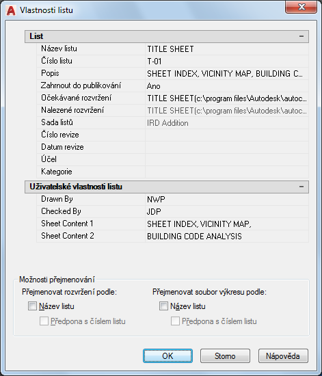 Zobrazuje vlastnosti vybraného listu. Také zobrazuje uživatelské vlastnosti (jestliže existují). Libovolnou vlastnost listu lze upravit zadáním nové hodnoty. Očekávané rozvržení je cesta a název souboru výkresu, do kterého byl list uložen. Nalezené rozvržení je cesta a název souboru výkresu, kde byl list nalezen. Jestliže se cesty liší, můžete upravit cestu a název souboru v poli Očekávané rozvržení. Touto operací znovu asociujete list se sadou listů.