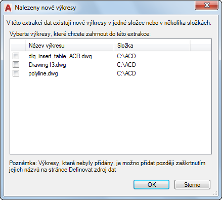 Zobrazuje seznam nových výkresů přidaných do složky, která byla vybrána k extrakci dat po ukončení extrakce.