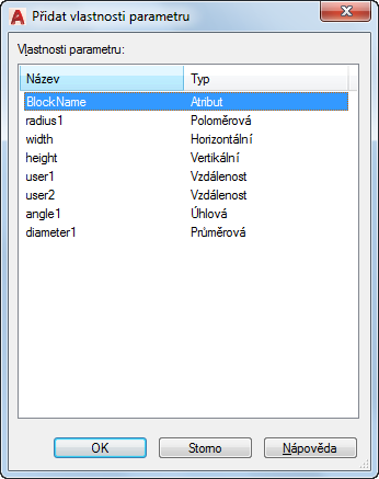 Slouží k zobrazení názvů parametrů dostupných pro přidání do tabulky vlastností bloku.