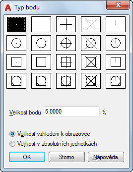 Nastavuje velikost zobrazení bodu. Zadaná hodnota může být relativní vzhledem k obrazovce nebo může být v absolutních jednotkách. Velikost zobrazení bodu se uloží do systémové proměnné PDSIZE. Objekty, které potom nakreslíte, budou používat novou hodnotu.