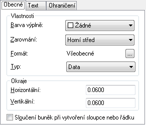 Řídí mezeru mezi ohraničením buňky a obsahem buňky. Nastavení okrajů buněk je použito na všechny buňky v tabulce. Výchozí nastavení je 0.06 (britské) a 1.5 (metrické).