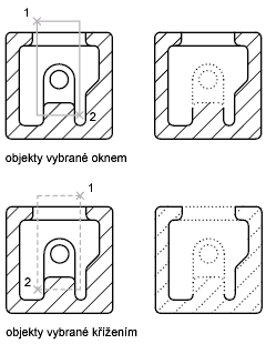 Při výběru oknem musí být v obdélníkové oblasti výběru většinou uzavřen celý objekt. Pokud je však objekt s nespojitým (tečkovaným) typem čáry viditelný ve výřezu pouze částečně a všechny viditelné vektory typu čáry mohou být ve výběrovém okně uzavřeny, bude vybrán celý objekt.