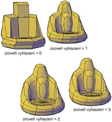 Síť bude vytvořena se zadanou úrovní vyhlazení. Vyhlazení může být v rozsahu od hodnot Žádné (0) až po výchozí maximální hodnotu (6) nebo až po zadanou úroveň. Při vyhlazení objektu se hustota rastru plošek sítě také zvýší. Nejlepších výsledků dosáhnete při vytvoření objektů sítě s nižší úrovní vyhlazení a zvýšení vyhlazení až po dokončení modelování.