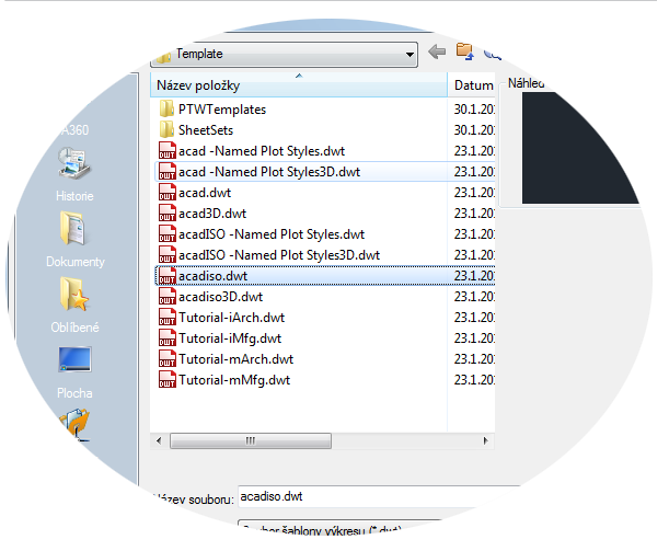 Chcete-li upravit existující soubor šablony výkresu, klikněte na tlačítko Otevřít, v dialogu Vybrat soubor zvolte položku Šablona výkresu (*.dwt) a vyberte soubor šablony.