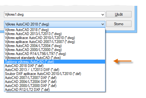 Libovolný výkresový soubor (.dwg) můžete uložit jako soubor šablony výkresy (.dwt). Můžete také otevřít existující soubor šablony výkresu, tuto šablonu upravit a znovu ji uložit (v případě potřeby pod jiným názvem).
