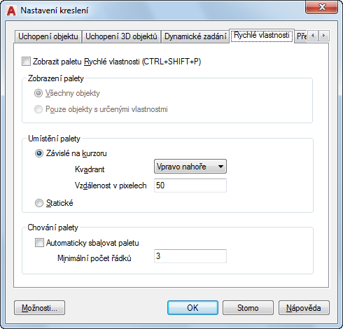 Nastavuje zobrazení palety Rychlé vlastnosti. Další informace viz Přizpůsobení panelu Rychlé vlastnosti.