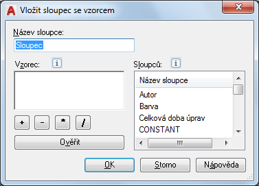Zobrazí názvy sloupců z extrahovaných dat výkresu a externích dat (pokud bylo vytvořeno propojení). Názvy sloupců je možné dvojitým kliknutím přidat do pole Vzorec nebo přetáhnout ze seznamu Sloupec do pole Vzorec. Existující sloupce s názvy nejsou v seznamu uvedeny a nelze je použít jako hodnoty pro vytvoření dalších sloupců se vzorci.