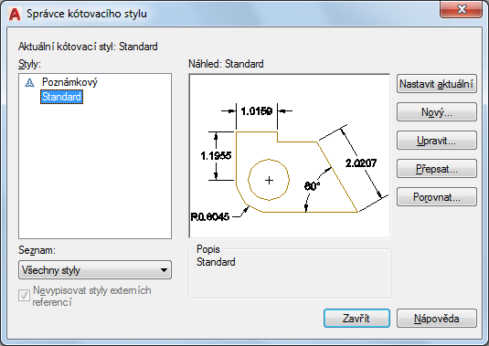 Položka vybraná v seznamu řídí zobrazení kótovacích stylů.