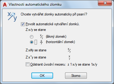Pokud je zapnuta možnost Automatický zlomek, převede znak lomítka (/) na šikmý zlomek.