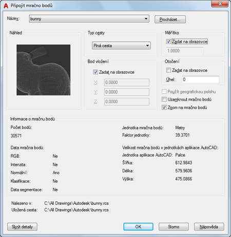 Připojení souboru projektu nebo snímku mračna bodů k výkresu, aby bylo možné s ním pracovat
