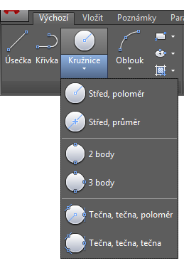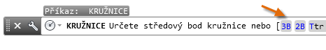 Případně můžete také v příkazovém okně zadat příkaz KRUŽNICE nebo jen zkratku KR a kliknutím vybrat požadovanou možnost. V takovém případě můžete určit středový bod, nebo můžete kliknout na jednu ze zvýrazněných možností příkazu, jak je znázorněno dole.