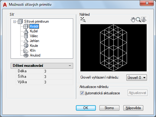 Určuje síťové primitivum, které je možno upravit. Výběrem typu primitiva (například kvádr nebo kužel) zobrazte jeho nastavení v části Dělení mozaikování.
