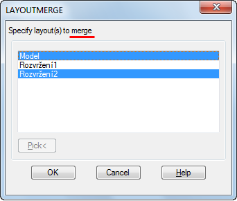 Můžete použít také příkazový řádek a příkaz -LAYOUTMERGE. Zobrazí se následující výzvy: