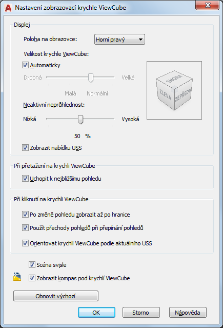 Zobrazuje náhled nástroje ViewCube v reálném čase, přičemž vychází z aktuálních nastavení.