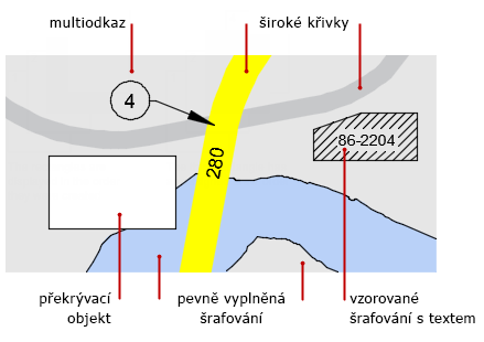 Můžete ovládat překrývající se objekty, které pokrývají plochy, jako jsou objekty se silnou tloušťkou čar, širokými křivkami, šrafováním a výplní, poznámkami a obrázky. Následující mapa například obsahuje několik různých typů překrývajících se objektů. Pořadí, ve kterém se tyto objekty zobrazení a vykreslují, je samozřejmě důležité.