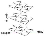 Kopíruje objekty do matrice řádků (osa X), sloupců (osa Y) a úrovní (osa Z). Pole musí mít minimálně dva řádky, dva sloupce nebo dvě úrovně.