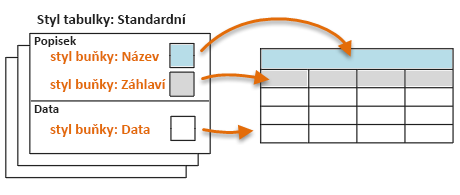 Výchozí styl tabulky, Standardní, obsahuje tři výchozí styly buněk: Název, Záhlaví a Data. Styly buněk Nadpis a Záhlaví jsou textovým typem buňky, zatímco styl buňky Data je datovým typem buňky.