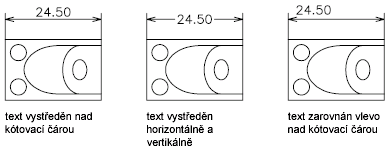 Jiné nastavení, například Zarovnání textu, může způsobit vertikální zarovnání textu. Pokud je například vybráno horizontální zarovnání, jako na levém krajním obrázku výše, text se nachází uvnitř vynášecích čar a je vystředěn uvnitř kótovací čáry horizontálně. Text je horizontální, i když kótovací čára sama o sobě horizontální není.