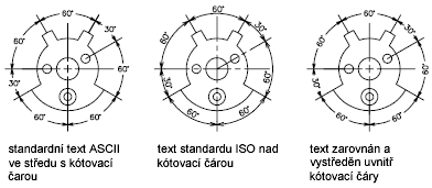 Poloha textu podél kótovací čáry se ve vztahu k vynášecím čarám označuje jako umístění textu. Chcete-li při vytváření kóty umístit text sami, použijte možnost Umísťovat text ručně v dialogu Upravit/Nový kótovací styl, karta Přizpůsobit. Text umístíte pomocí automatických možností umístění textu na střed kótovací čáry, do vynášecí čáry nebo nad vynášecí čáru.