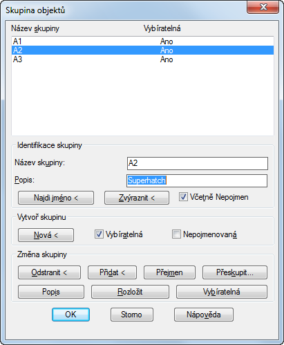 3) Vyberte skupinu. Všimněte si, že v poli s popisem skupin vytvořených nástrojem SUPERHATCH se zobrazí „superhatch“.