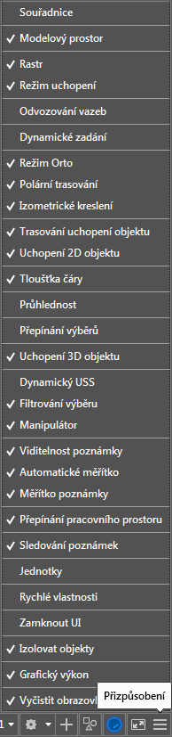 Poznámka: Zobrazení souřadnic není implicitně vidět na stavovém řádku. Zobrazení souřadnic na stavovém řádku zapnete výběrem možnosti Souřadnice na tlačítku Přizpůsobení stavového řádku.