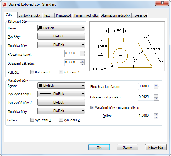 Nastavuje formát a vlastnosti kótovacích čar, vynášecích čar, šipek a středových značek.