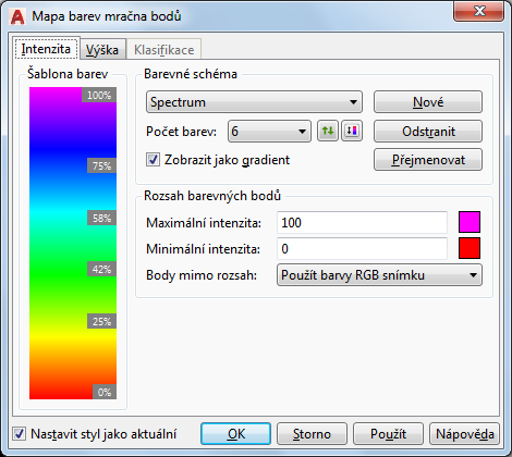 Upraví nastavení barevného schématu pro styly intenzity mračna bodů.
