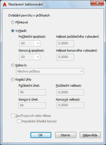 Vytvoří hladký uzavřený povrch, jehož švy nebudou při změně jeho tvaru zalomeny. Tato možnost je dostupná, pouze pokud je šablonování nastaveno na možnost Přímkové nebo Vyhladit a pokud byla vybrána možnost Zavřít povrch nebo těleso.