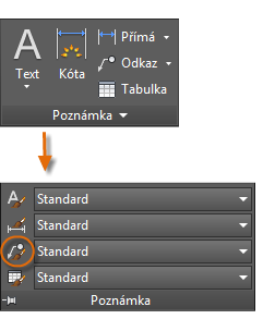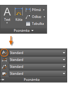 Stejně jako řada dalších funkcí poznámek, nabízí víceřádkový text mnoho možností nastavení. Tato nastavení můžete uložit pomocí příkazu PÍSMO jako styl textu. Přístup ke stylům textu, které jste uložili, pak můžete získat kliknutím na rozevírací šipku na panelu Poznámka. Aktuální styl textu je zobrazen v horní části rozevíracího seznamu.