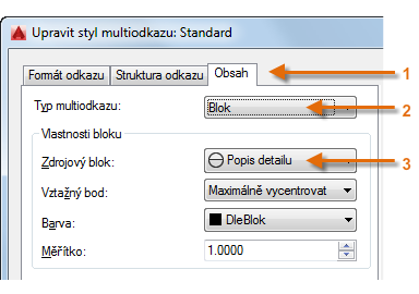 Chcete-li například vytvořit styl „odkaz na detail“, spusťte příkaz MODKAZSTYL. V dialogu Správce stylů multiodkazů klikněte na tlačítko Nový a zvolte popisný název nového stylu multiodkazu. Klikněte na kartu Obsah, vyberte položku Blok a potom položku Popis detailu, jak je znázorněno.