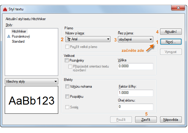 Při vytváření nového stylu textu zadejte jeho název a potom vyberte písmo a styl písma. Pořadí, v jakém klikáte na tlačítka, je uvedeno níže: