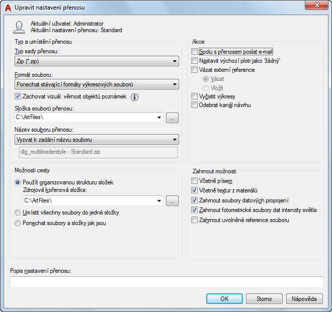 | Vyzvat k zadání názvu souboru | Zobrazí standardní dialog pro výběr souborů, kde můžete zadat název souboru přenosového balíku. |