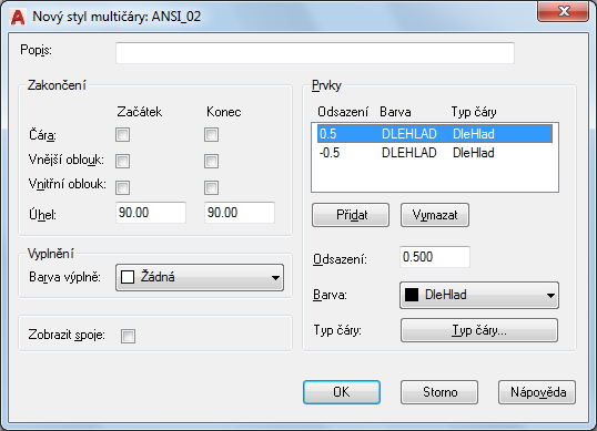 Přidá do stylu multičáry nový prvek. Není k dispozici, dokud nezvolíte barvu nebo styl čáry z jiného stylu křivky, než je STANDARDNÍ.