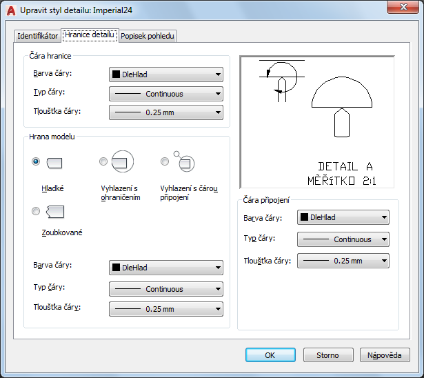 Nastavuje vlastnosti hraniční linie detailu, hrany modelu a čáry připojení v detailech.