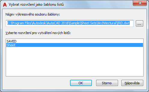 Určuje cestu ke složce, soubor šablony výkresu (DWT) a název rozvržení, jehož pomocí jsou vytvořeny nové listy.