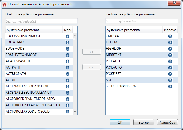 Můžete vybrat nebo vyhledat systémovou proměnnou, která má být přidána nebo odebrána ze seznamu sledovaných systémových proměnných.