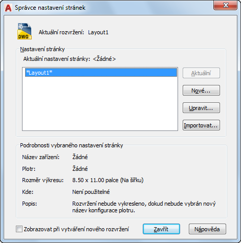 Můžete také vytvořit pojmenovaná nastavení stránek, upravit existující nebo importovat nastavení stránek z jiných výkresů.