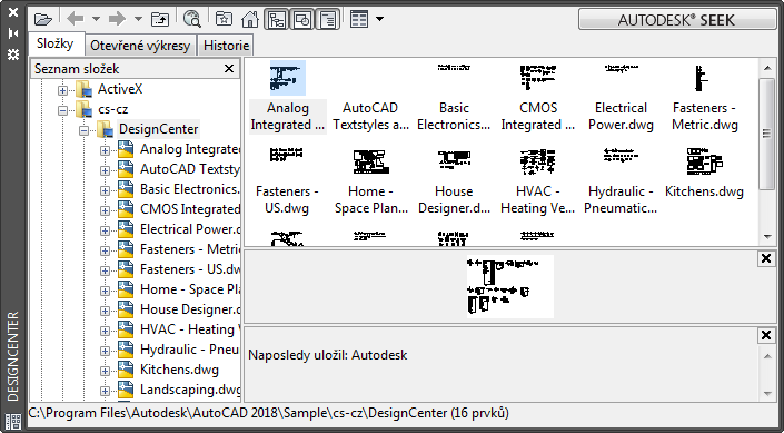 Pomocí stromového zobrazení vlevo lze procházet zdroje obsahu a zobrazovat obsah v oblasti pro obsah vpravo. Z oblasti pro obsah můžete přidávat položky do výkresu nebo do palety nástrojů. Pro vybrané výkresy, bloky, šrafovací vzory nebo externí reference se zobrazuje náhled nebo popis.