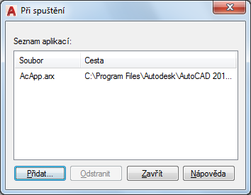 Přidává aplikace do seznamu Při spuštění a odstraňuje je z něj. Jedná se o aplikace, které jsou načteny při každém spuštění aplikace AutoCAD.
