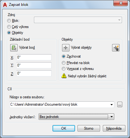 Po jejich uložení převede vybraný objekt nebo objekty na blok v aktuálním výkresu.