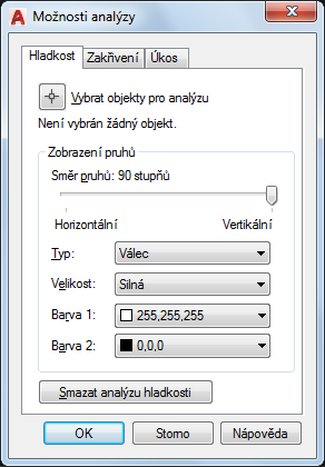 Karty na dialogu obsahují nastavení k úpravě všech tří typů analýzy těles a povrchů: Zebra analýzy (spojitosti), zakřivení a úhlu zkosení.