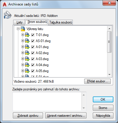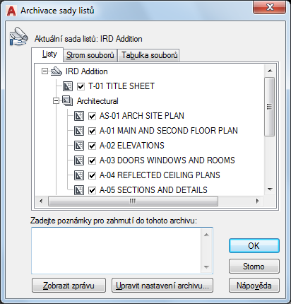 Obsahuje listy, které budou obsaženy v archivu v pořadí listů a podle uspořádání podsady. Je nutné, aby byl list otevřen ve Správci sady listů. Příkaz Archivace je možné zvolit v místní nabídce, která se zobrazí po kliknutí pravým tlačítkem myši na horní uzel sady listů, nebo je možno zadat příkaz ARCHIVUJ na příkazovém řádku.