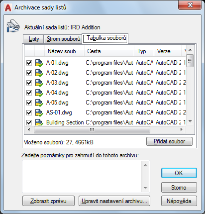 Zobrazuje soubory archivu ve formátu tabulky. Implicitně jsou všechny soubory spojené s aktuálním výkresem (například externí reference, styly vykreslování a písma) uvedeny v seznamu. Soubory můžete přidat do archivu nebo odstranit existující soubory. Související soubory, které jsou odkazovány adresami URL, nebudou do archivu zahrnuty.