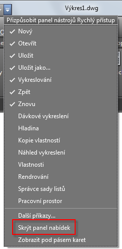 Panel nabídek lze povolit v rozevíracím seznamu na panelu nástrojů Rychlý přístup nebo pomocí příkazu CUI sloužícího k přizpůsobení uživatelského rozhraní.
