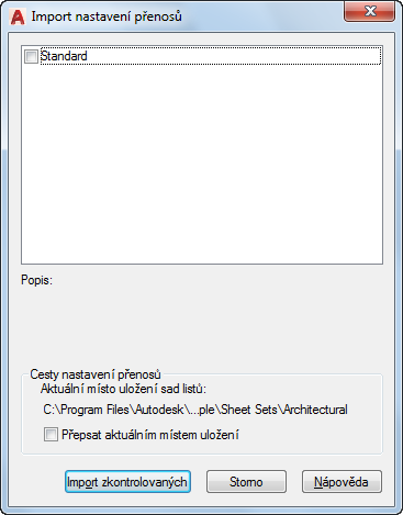 Importuje nastavení přenosu ze seznamu, která jsou zatržena.