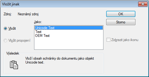 Vloží obrázek ikony aplikace namísto dat. Dvojitým kliknutím na ikonu lze data zobrazit nebo editovat.