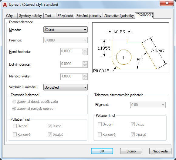 Nastaví maximální neboli horní hodnotu tolerance. Pokud jako metodu zvolíte Symetricky, bude tato hodnota použita jako tolerance. (Systémová proměnná DIMTP)