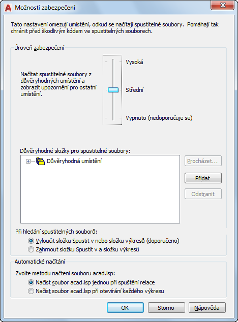 Řídí omezení zabezpečení pro spuštění spustitelných souborů v aplikaci AutoCAD.