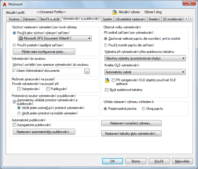 Nastavuje výchozí výstupní zařízení pro nové výkresy a výkresy vytvořené ve verzi AutoCAD Release 14 nebo dřívějších, které ještě nebyly uloženy ve formátu AutoCAD 2000 nebo novějším.