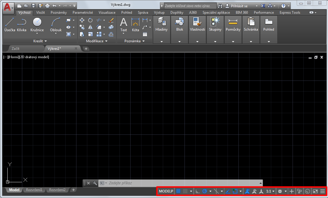 Na stavovém řádku se zobrazují umístění kurzoru, kreslicí nástroje a nástroje, které ovlivňují prostředí výkresu.